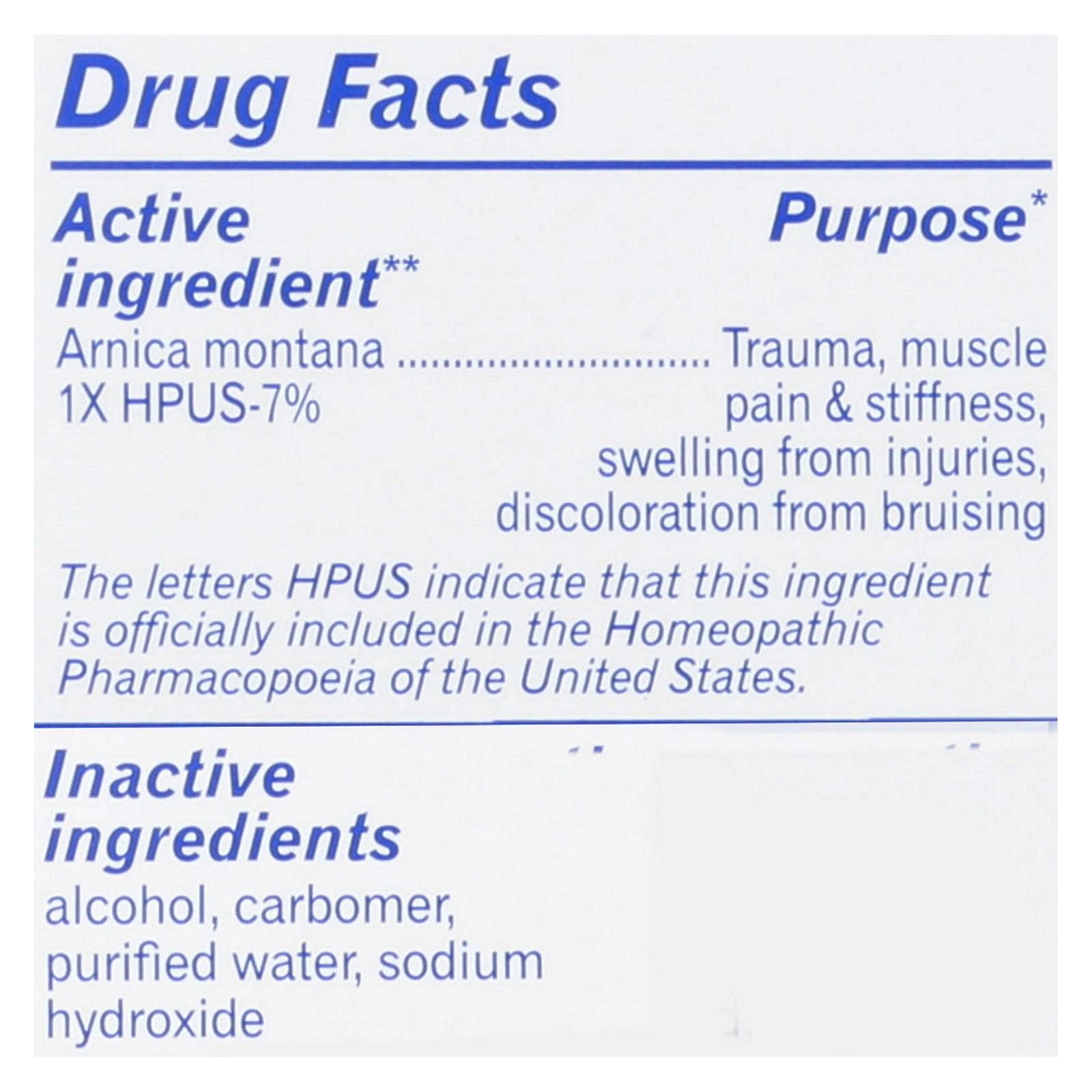 ingredients : alcohol;carbomer;purified water;sodium hydroxide;arnica montana 1x hpus-7% purpose* trauma;muscle pain & stiffness;swelling from injuries;discoloration from bruising. Inactive alcohol