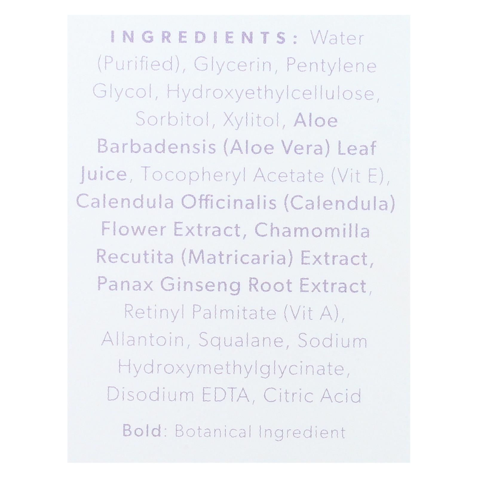 ingredients : water;purified;glycerin;pentylene glycol;hydroxyethylcellulose;sorbitol;xylitol;aloe barbadensis;aloe vera;leaf juice;tocopheryl acetate;vit e;calendula officinalis;calendula;flower extract;chamomilla recutita;matricaria;extract;panax ginseng root extract;retinyl palmitate;vit a;allantoin;squalane;sodium hydroxymethylglycinate;disodium edta;citric acid