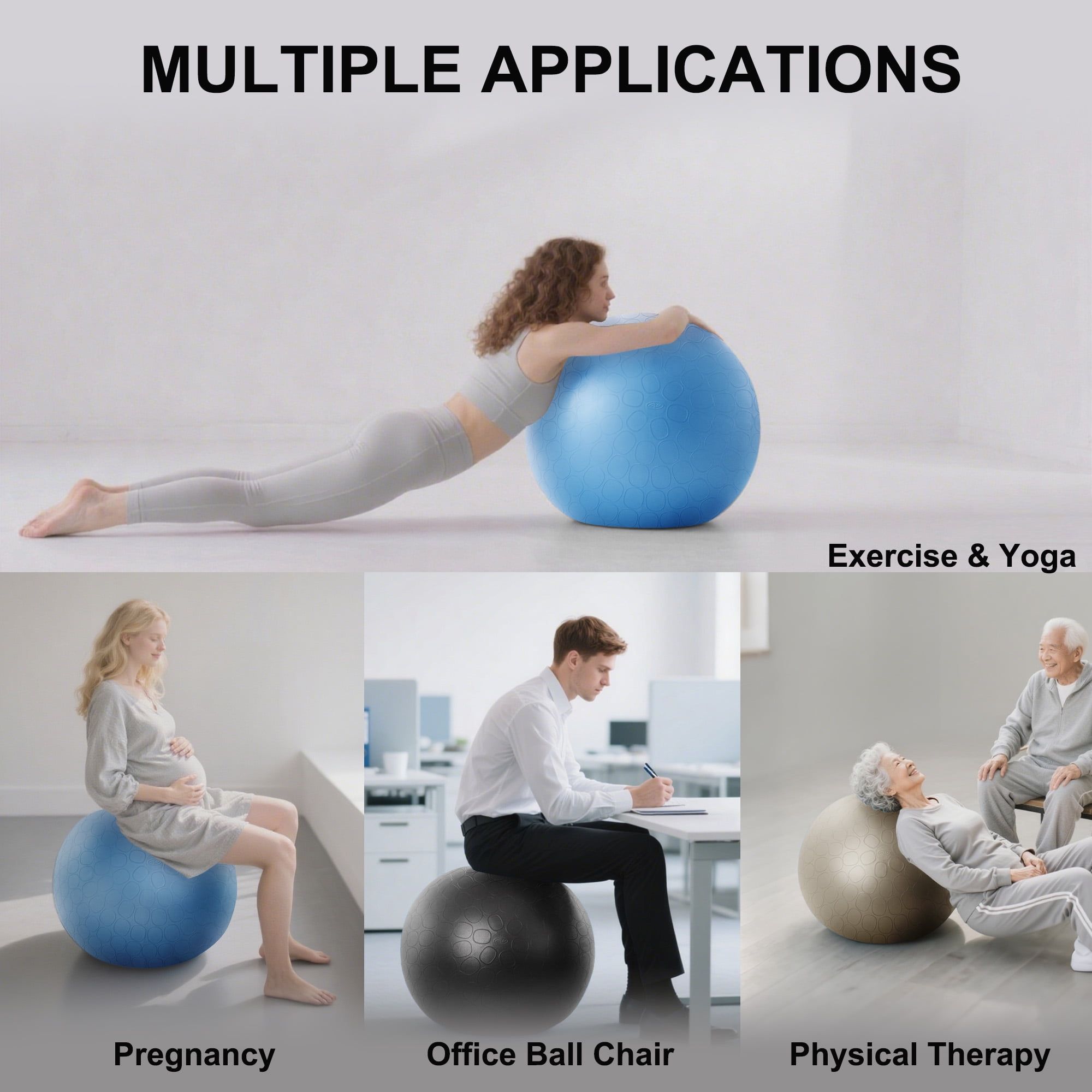 Enhanced Stability: Features non-slip stripes and a frosted texture to increase friction with both the user and the ground, ensuring stable workouts.Quick Setup: Includes a rapid inflation pump for effortless and quick setup, allowing for easy inflation of the ball.Robust Capacity: Supports a 360lb anti-slip static loading capacity, providing safe use for diverse fitness levels and body types.Versatile Toning: Ideal for toning muscles, improving balance, and enhancing core strength through various exercises like yoga and Pilates.Comfortable Grip: The simple, smart design with anti-slip ribbed patterns and a matte surface offers a comfortable feel and prevents slipping during workouts.