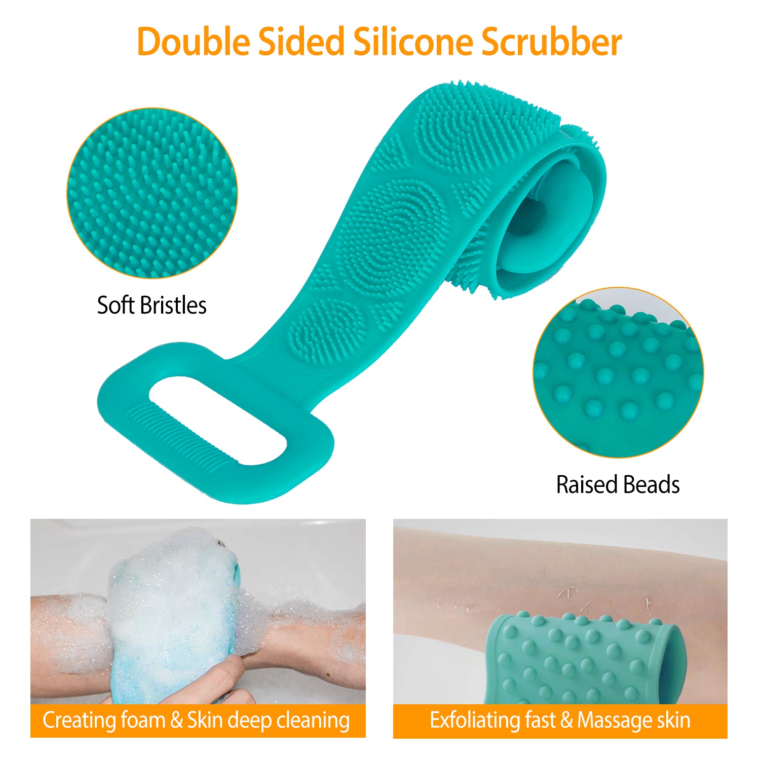 Silicone Back Scrubber Belt For Shower Exfoliating Foaming Body Wash Strap Brush Bristles Massage Dots W/ Adhesive Hook